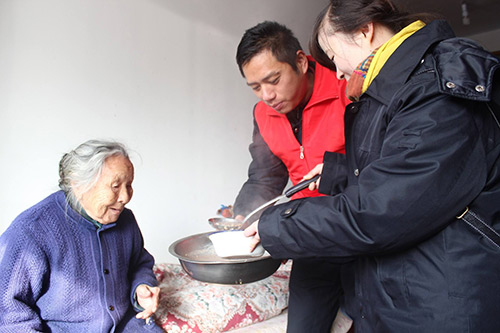 志愿者為老人奉送愛心粥